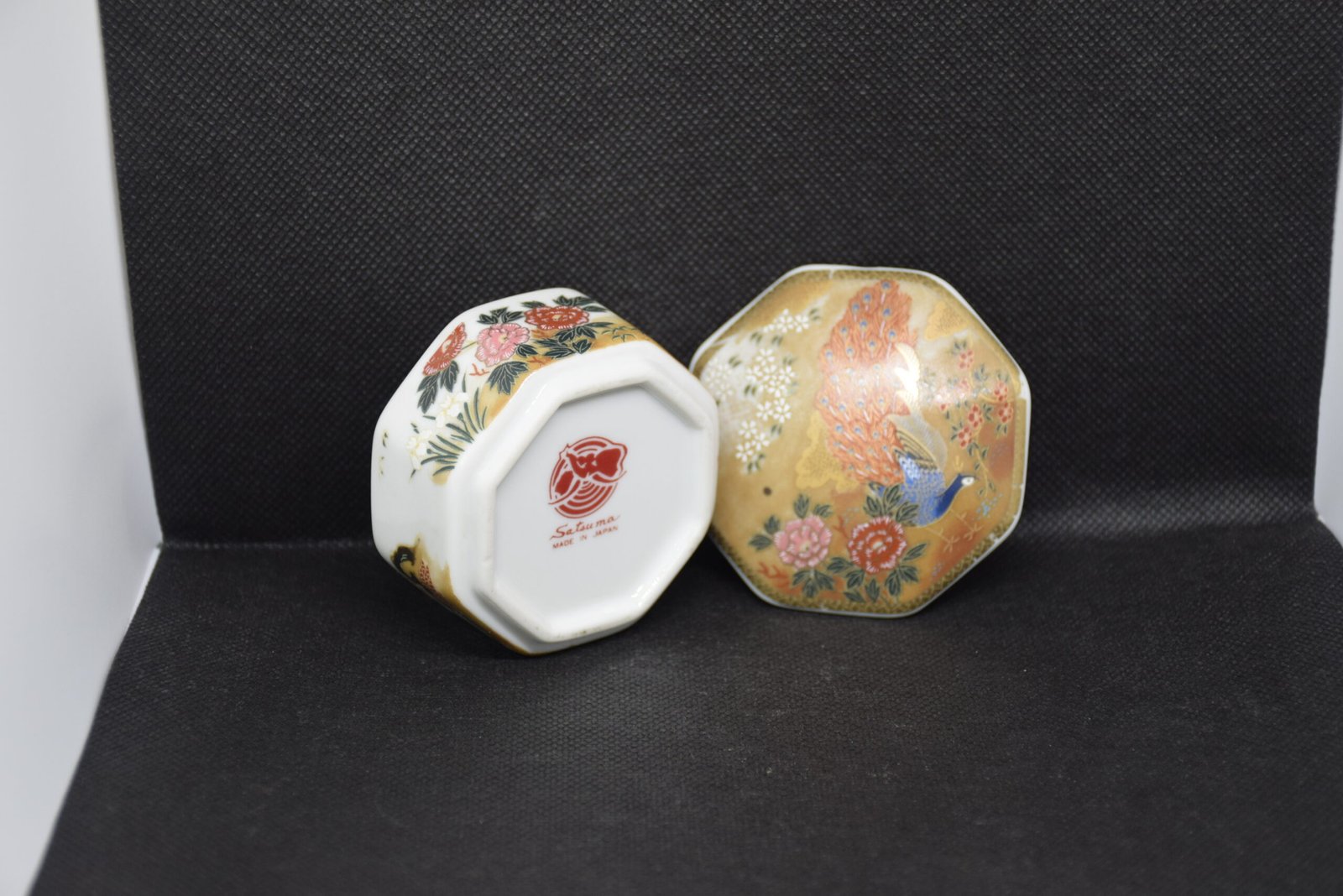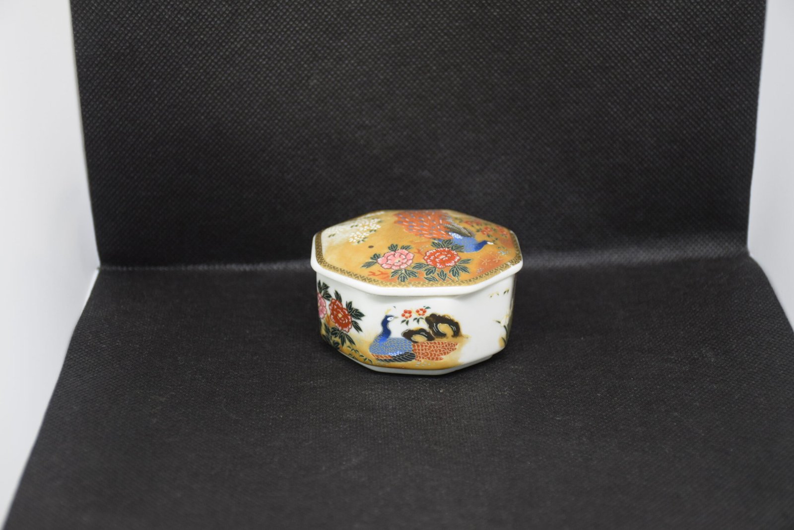 Cajita joyero Satsuma de porcelana, forma hexagonal, pavo real y flores con dorado. Pieza vintage japonesa en excelente estado.