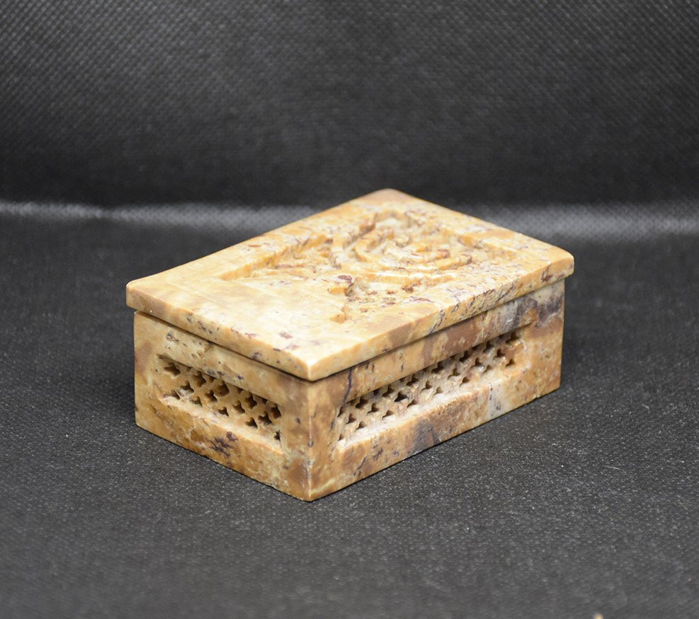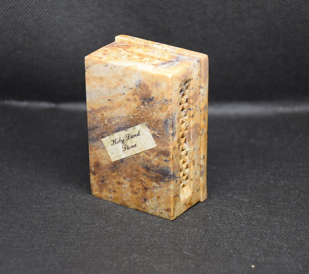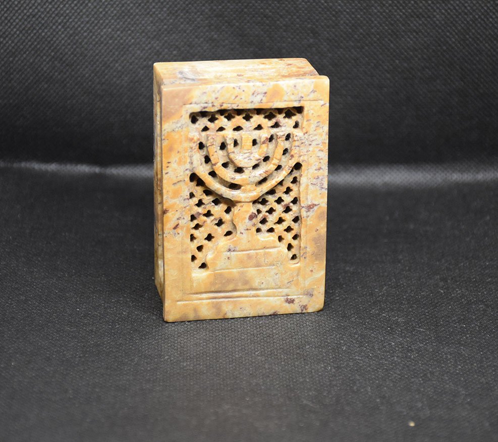 Caja decorativa hecha con piedra auténtica de la Tierra Santa (Holy Land Stone), tallada a mano con un diseño calado en el frontal representando una menorá (símbolo tradicional del judaísmo).