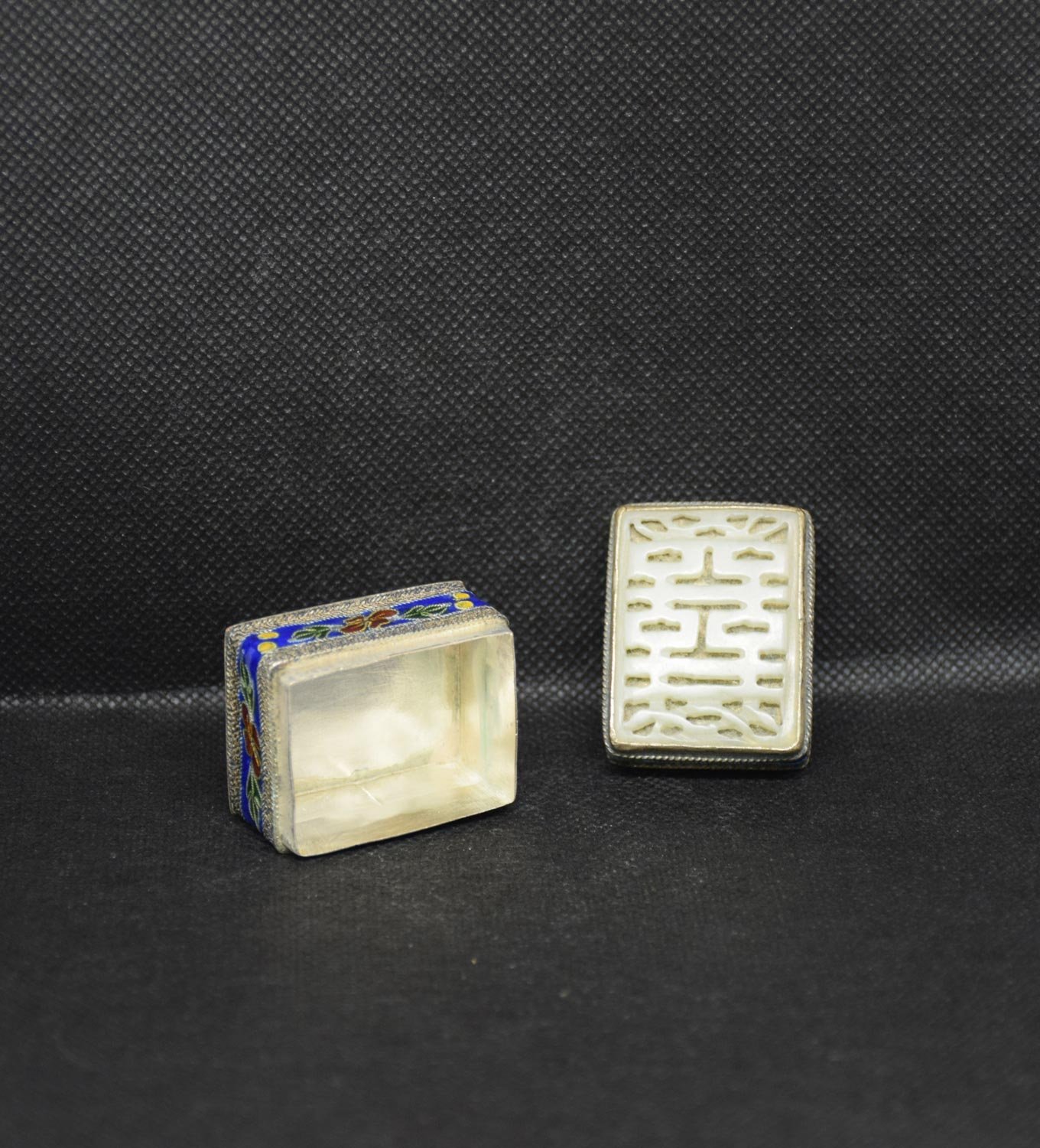 Esta elegante caja rectangular combina tradición y color en una pieza única de inspiración oriental. Su tapa blanca, tallada con símbolos estilizados, contrasta con los laterales decorados en esmalte vítreo, donde florecen motivos florales y geométricos en tonos vibrantes de azul, rojo, verde y dorado.