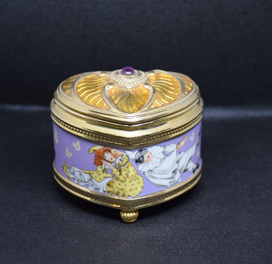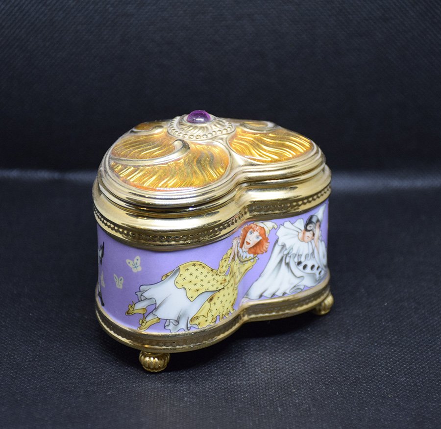 Caja musical Fabergé “Dulcinella” con escena teatral pintada a mano, tapa dorada y gema púrpura. Edición de colección por Franklin Mint.