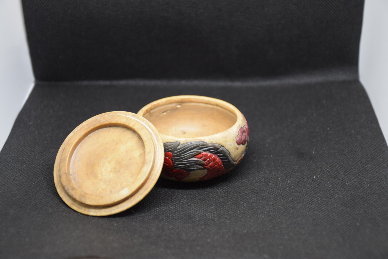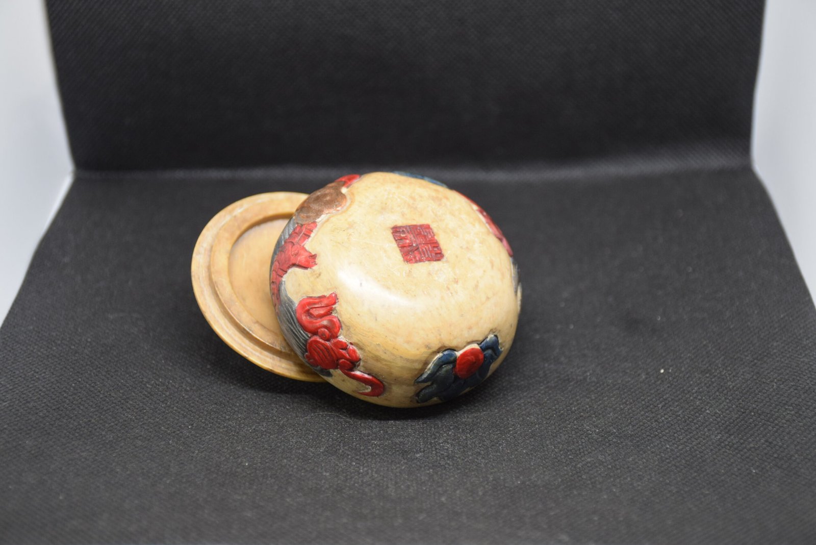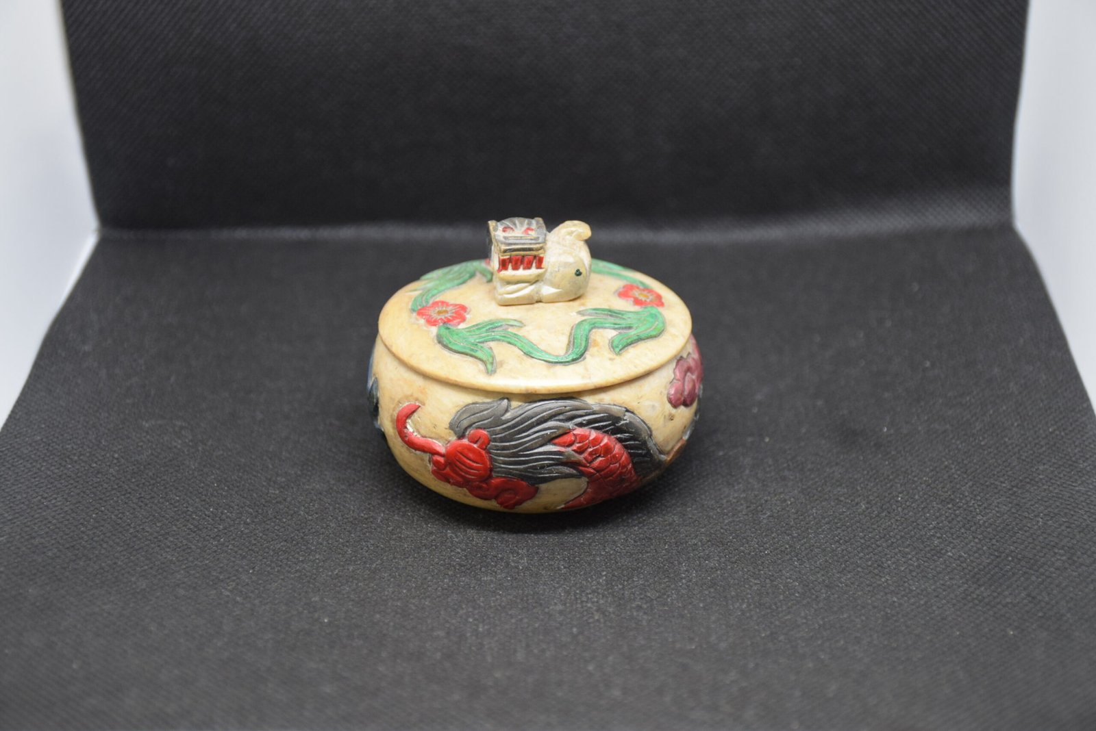Encantadora cajita de soapstone (esteatita) tallada a mano y policromada. En el cuerpo luce un dragón en relieve y motivos florales; en la tapa, un elefante que hace de tirador. Conserva en la base un sello rojo con caracteres chinos. Su tono marfilado y la pátina del tiempo aportan un carácter muy decorativo. Perfecta para guardar pequeños tesoros o como detalle oriental en el hogar.